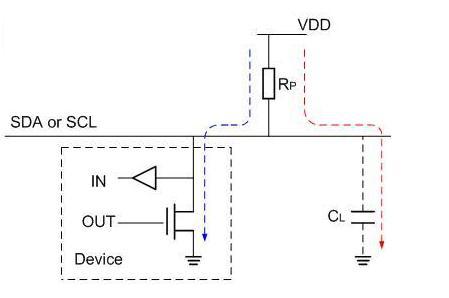 如果RC充電時間常數過大,將使得信號上升沿變化緩慢,達不到數據傳輸的要求。因此一般應用中選取的都是幾KΩ量級的上拉電阻,比如都選取4K7的電阻。小阻值的RP電阻增大了端口Sink電流,故在可能的情況下,RP取值應稍大一點,以減少耗電。另外,通產情況下,SDA,SCL兩條線上的上拉電阻取值是一致的,并上拉到同一電源上。